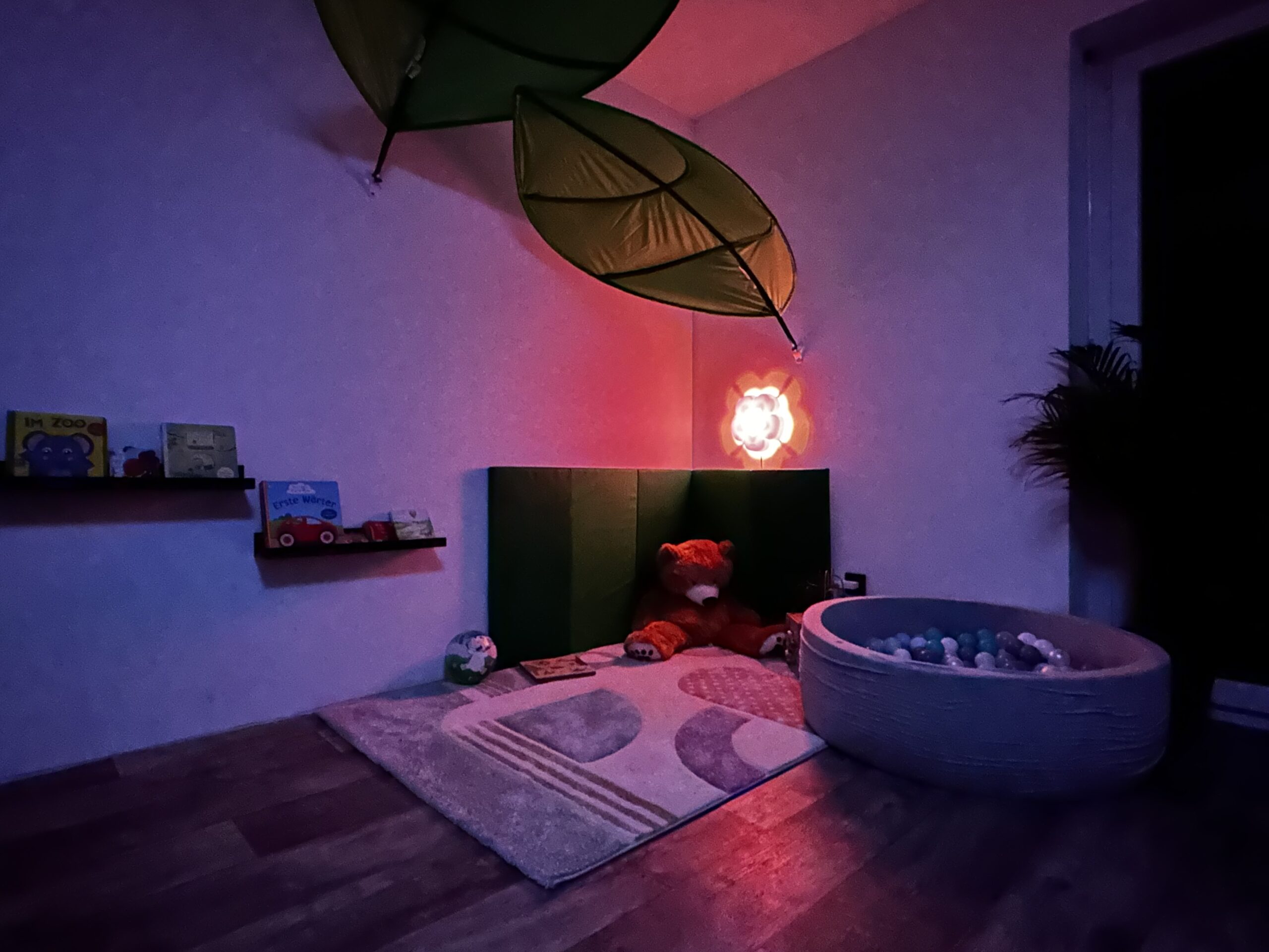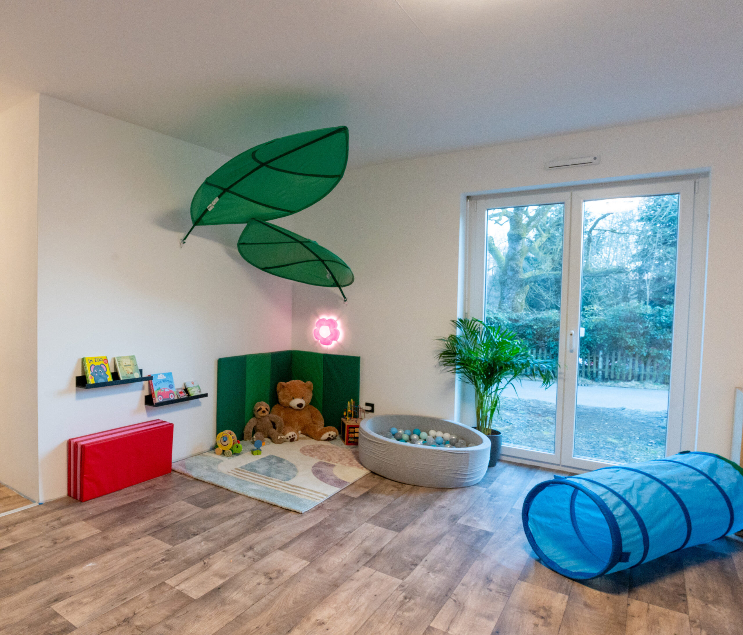 Liebevolle gestalteter Spielbereich mit Blätter-Dekor, kuscheligem Teppich und Bällebad