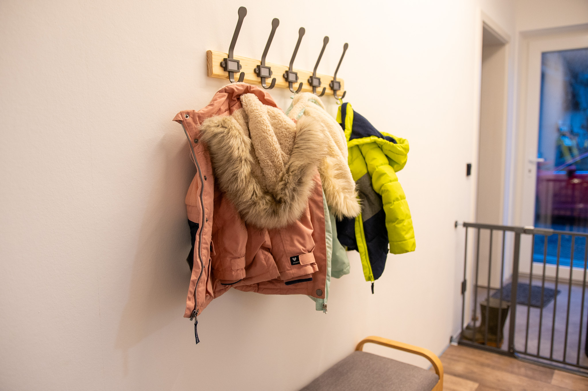 Garderobe im Detail mit beschriftbaren Haken für Jacken und Matschhosen