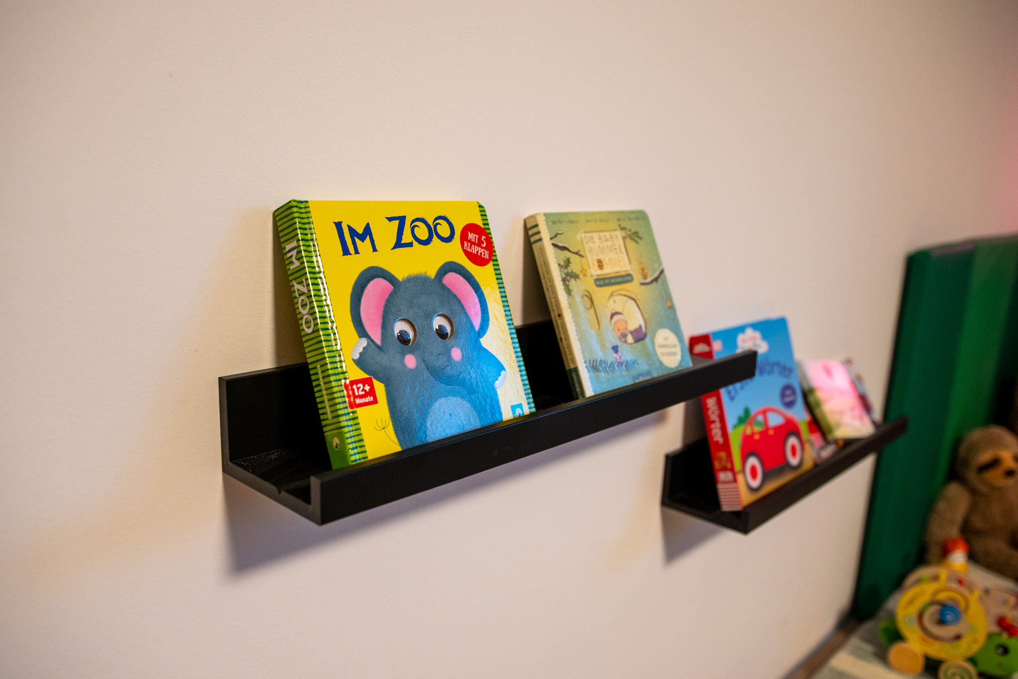 Die Bücherleisten in Kinderhöhe bieten eine bunte Auswahl zum Stöbern und Entdecken.
